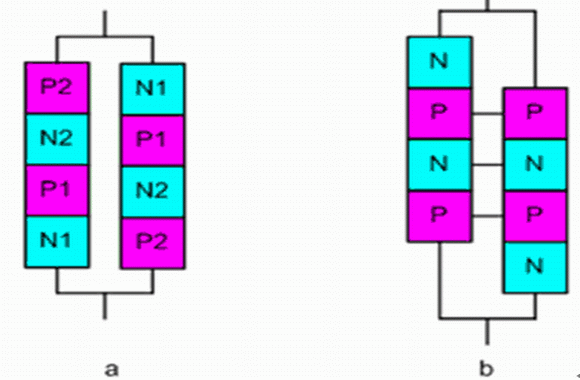 圖5 非平行的晶閘管 a) 一對非平行的晶閘管 b) 集成于單個硅器件的非平行的晶閘管