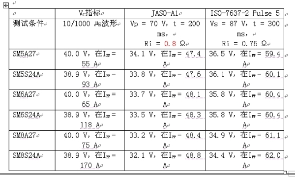 表A-2所示為Vishay的大功率硅TVS在不同測試規(guī)范下的測試結(jié)果。