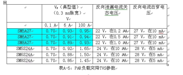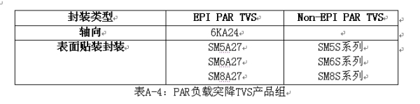 Vishay有兩種類型的汽車電子初級保護負載突降TVS:EPI PARTVS和Non-EPI PARTVS。PAR TVS的產(chǎn)品組列在表A-4當(dāng)中。