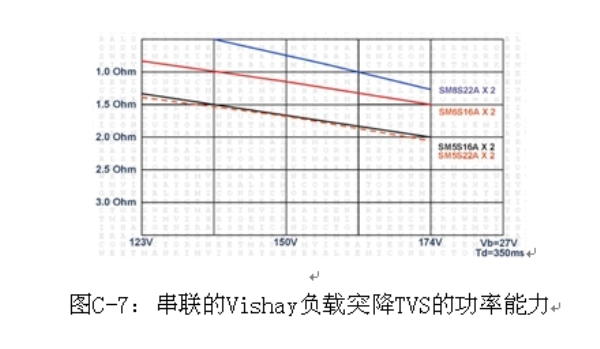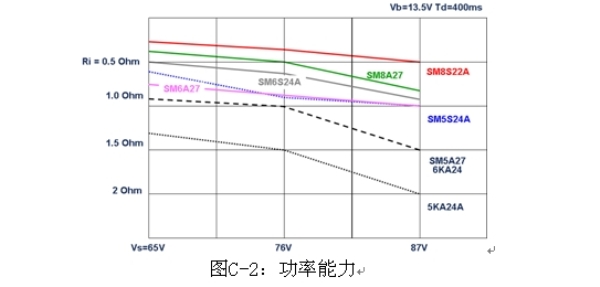 圖C-6是兩個串聯(lián)TVS的典型應(yīng)用,圖C-7是各種線路電阻和電壓條件下兩個串聯(lián)的負載突降TVS的功率能力。