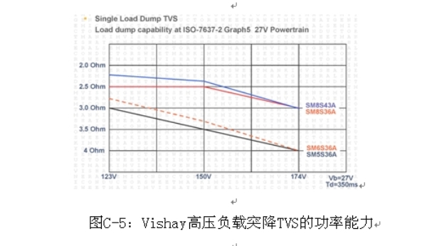 圖C-4考慮到了汽車電子中半導(dǎo)體的最大輸入電壓的約定是75 V的需求,某些Vishay負載突降系列可以滿足42 V電源系統(tǒng)的要求。