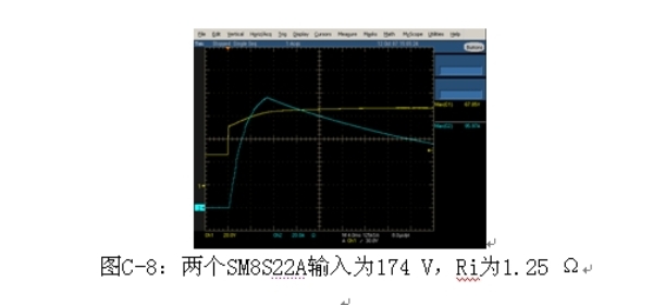 至少,兩個串聯(lián)的SM5S22A箝位負載突降電壓輸入為174 V,線路電阻為2 Ω,而SM6S22A或SM8S22A具有更低的箝位電壓和更低的線路電阻。