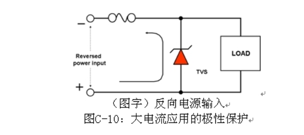 大電流應(yīng)用極性保護的一種解決方案是使用高正向電流能力的整流器,或者是在電力線中使用沒有極性保護二極管的負載突降TVS,如圖C-10所示。