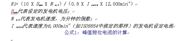 對于14 V系統(tǒng)的大型發(fā)電機來說,由以下ISO7637-2和ISO-8854的公式1)得出的220 A的發(fā)電機內(nèi)阻為0.33 Ω,300 A型的內(nèi)阻為0.24 Ω。