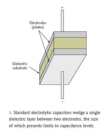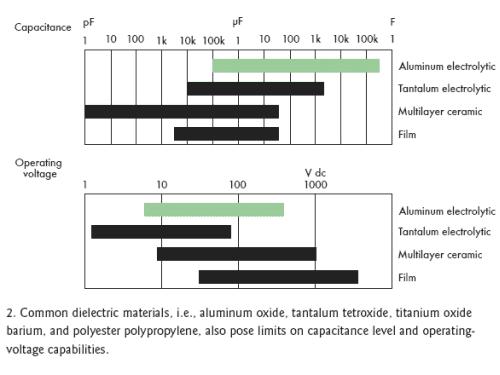 [page]標準電容的結(jié)構(gòu)是在兩個附屬于金屬板上的電極之間夾一層電介質(zhì)層(圖1)。根據(jù)電容類型不同,電介質(zhì)可以是氧化鋁、四氧化鉭、氧化鈦鋇或聚丙烯聚酯,不同的材料決定了不同的容量和電壓特性(圖2)。電介質(zhì)的多少和極板間的距離也會影響電容量。然而,極板間最大允許距離限制了電介質(zhì)的數(shù)量。