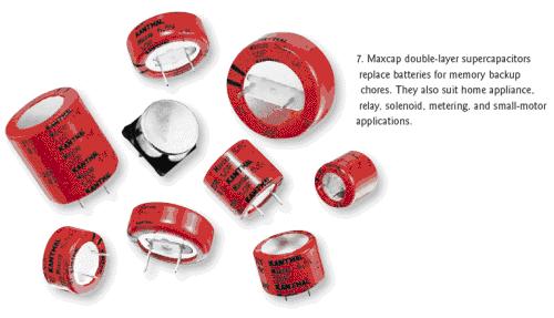 KanthalGlobar公司的Maxcap雙層電容器可以用來代替作為存儲器后備電源的電池,具有超過5.5F/in.3的容積效率、無限的服務壽命、快速充放電能力和非常低的漏電流等特性(圖7)。KanthalGlobar公司還表示,這些電容比電池更安全,在短路時不會爆炸,也不會損壞。這些電容器是非極化器件,不需要限流電阻或過壓保護,因而可以消除裝配錯誤和相關(guān)的成本。