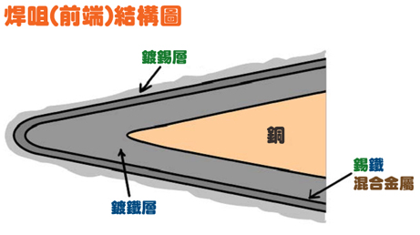 進行焊接時,錫跟鐵會不斷產生混合反應,而由于所產生的混合金屬會從焊咀鍍層表面剝落,因此焊咀鍍層會逐漸被侵蝕掉,繼而錫會很快速地侵蝕焊咀內的銅,最后會在很短時間內造成焊咀穿洞(圖4)。
