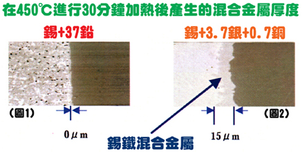 圖1表示當使用63/37傳統(tǒng)焊錫時是近乎不會產生混合金屬的,但當使用錫+3.7銀+0.7銅的無鉛焊錫時便會產生15微米厚度的混合金屬了(圖2)。