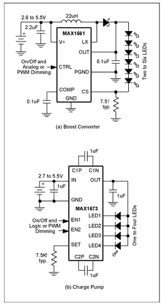 圖1.MAX1561升壓轉(zhuǎn)換器(a)和MAX1573電荷泵(b)是2種LED供電方案。電路復(fù)雜度基本相同,但電荷泵不需要電感。