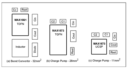 圖3.因為要使用電感,升壓轉(zhuǎn)換器(a)比電荷泵(b)占用更大的電路板空間和高度。如果使用晶片級封裝的MAX1573和0402封裝的1μF電容,整個電荷泵方案(c)的尺寸就會非常小。