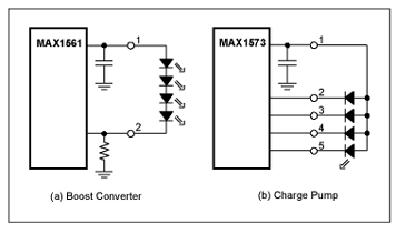 圖1給出了兩種方案的電路圖,兩個電路都只有幾個簡單的外部元件,但升壓轉(zhuǎn)換器需要電感和肖特基二極管(有些升壓轉(zhuǎn)換器內(nèi)部集成肖特基二極管,但通常會降低效率)。