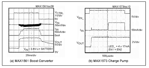 圖6.MAX1561升壓轉(zhuǎn)換器(a)和MAX1573電荷泵(b)的軟啟動和關(guān)斷波形都表明沒有輸入過沖電流(IIN),使電池跌落最小,以免對系統(tǒng)的其它電路造成影響。