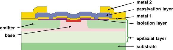 通過選擇不同的低電阻襯底,比如:圖1所示的摻磷/摻砷襯底,可以有效降低半導(dǎo)體中的電壓降比例。另一個(gè)重要的影響因素是電流分配,應(yīng)在整個(gè)芯片范圍內(nèi)盡可能保持均衡,將芯片前端金屬化擴(kuò)展電阻降至最低。對(duì)于BISS晶體管,芯片中的均衡電流分配通過一種稱為網(wǎng)格技術(shù)的手段來實(shí)現(xiàn)——將晶體管分成不同的格柵結(jié)構(gòu)。第四代BISS晶體管采用受專利保護(hù)的雙層金屬化布局,能夠最大程度提升發(fā)射極線路金屬厚度,降低飽和電阻(參見圖2)。