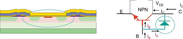 要在降低飽和電壓的基礎(chǔ)上縮短開關(guān)時(shí)間,關(guān)鍵是最大程度降低開關(guān)操作中晶體管的擴(kuò)展電容。這主要通過集成寄生的鉗位結(jié)構(gòu)(圖3)來實(shí)現(xiàn),該設(shè)計(jì)可以避免過驅(qū)動(dòng)處于飽和狀態(tài)的晶體管,能夠有效降低晶體管的存儲(chǔ)時(shí)間ts。