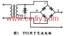 圖1所示是一個雙向TVS在交流電路中的應(yīng)用電路。應(yīng)用TVS可以有效地抑制電網(wǎng)帶來的過載脈沖,從而起到保護(hù)整流橋及負(fù)載中所有元器件的作用。圖1中的TVS箝位電壓應(yīng)不大于電路的最大允許電壓。