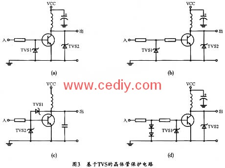 各種瞬變電壓能使晶體管的EB結(jié)或CE結(jié)擊穿而損壞,特別是晶體管集電極有感性(線圈、變壓器、電動機(jī))負(fù)載時,通常會產(chǎn)生高壓反電勢,因而可能使晶體管損壞。在實際應(yīng)用中,建議采用TVS作為保護(hù)器件。圖3所示為TVS保護(hù)晶體管的四種電路實例。
