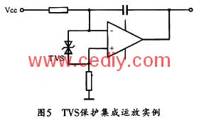 集成運放對外界電應(yīng)力非常敏感。因此,在使用運放的過程中,如果因操作失誤或采取了不正常的工作條件,往往會出現(xiàn)過大的電壓或電流,特別是浪涌和靜電脈沖,從而很容易使運放受損或失效。圖5所示是用TVS在運放差模輸入端防止過壓損傷的保護(hù)電路。