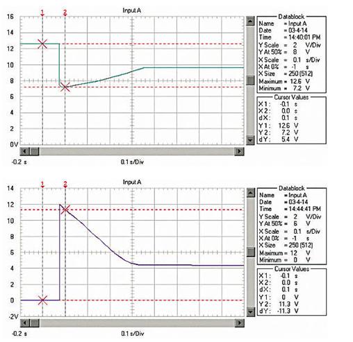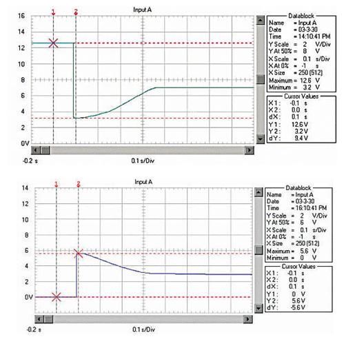 由于RM、RB、RL均非常低,啟動電流非常大。例如用12V、45Ah的蓄電池啟動安裝1.9升柴油機的汽車,蓄電池的電壓在啟動瞬間由12.6V降到約3.6V!啟動過程的蓄電池電壓波形如圖1;啟動瞬時的電流達550A,約為蓄電池的12C的放電率!啟動過程的蓄電池電流波形如圖2,(電流傳感器的電流/電壓變換比率:100A/V)。盡管車用蓄電池是啟動專用蓄電池,可以高倍率放電,但在圖1中可以看出,10倍以上的高倍率放電時的蓄電池性能變得很差,而且,如此高倍率放電對蓄電池的損傷也是非常明顯的。啟動過程的電壓劇烈變化也是極強的電磁干擾,可以造成電氣設備的“掉電”,迫使電氣設備在發(fā)電機啟動過程結束后重新上電,計算機在這個過程中非常容易死機。因此,無論從改善汽車電氣設備的電磁環(huán)境還是改善汽車的啟動性能和蓄電池的性能、延長使用壽命來考慮,改善汽車電源在啟動過程的性能是必要的。
