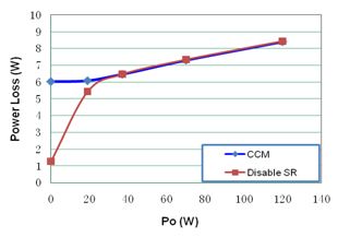 通過(guò)ADP1043的GUI可以設(shè)置關(guān)閉同步整流時(shí)的電流閾值。當(dāng)輸出電流值低于該閾值時(shí),關(guān)閉同步整流。如圖6所示為采用ADP1043設(shè)計(jì)的全橋拓?fù)涞哪K電源在不關(guān)閉和關(guān)閉同步整流在輕載條件下的損耗的情況??梢钥吹?,當(dāng)關(guān)閉同步整流后,大大減少了電源的輕載損耗。