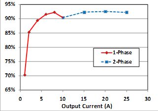 但是,隨著負(fù)載的減少,電路進(jìn)入輕載狀態(tài),開(kāi)關(guān)管的開(kāi)關(guān)損耗逐漸占主導(dǎo),此時(shí),輸出由一相供電就已經(jīng)足夠,多相的并聯(lián)反而使開(kāi)關(guān)損耗成倍增加。因而,在輕載時(shí),僅留一相工作,關(guān)閉多相模式,可以明顯改善電路在輕載時(shí)的效率。如圖7所示,為采用ADP1043所設(shè)計(jì)的交錯(cuò)式雙管正激電路。當(dāng)輸出電流值低于通過(guò)GUI所設(shè)置的閾值時(shí),ADP1043便會(huì)關(guān)閉QA2、QB2的驅(qū)動(dòng)信號(hào),以減少損耗。圖8所示為采用切相技術(shù)的電源的效率曲線,可以發(fā)現(xiàn)當(dāng)輸出電流低于10A時(shí),電源工作在單相模式下,效率有了明顯的提高。