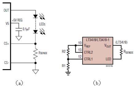 調(diào)節(jié)LED的電流最簡(jiǎn)單的方法就是改變和LED負(fù)載串聯(lián)的電流檢測(cè)電阻(圖2a),幾乎所有DC-DC恒流芯片都有一個(gè)檢測(cè)電流的接口,是檢測(cè)到的電壓和芯片內(nèi)部的參考電壓比較,來(lái)控制電流的恒定。但是這個(gè)檢測(cè)電阻的值通常很小,只有零點(diǎn)幾歐,如果要在墻上裝一個(gè)零點(diǎn)幾歐的電位器來(lái)調(diào)節(jié)電流是不大可能的,因?yàn)橐€電阻也會(huì)有零點(diǎn)幾歐了。所以有些芯片提供一個(gè)控制電壓接口,改變輸入的控制電壓就可以改變其輸出恒流值。例如凌特公司的LT3478(圖2b)只要改變R1和R2的比值,也可以改變其輸出的恒流值。