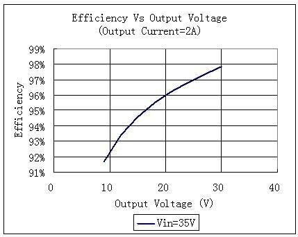 圖中的輸入電壓為35V,輸出電流為2A,當(dāng)輸出電壓為30V時(shí),效率可以高達(dá)97.8%。但是當(dāng)輸出電壓降低到20V時(shí),效率就降為96%;當(dāng)輸出電壓降低為10V時(shí),效率就降低為92%。在這三種情況下,盡管其輸出功率依次為60W,40W和20W,但是其損耗功率卻依次為1.2W,1.6W,1.6W。后兩種情況下功耗增大了33%。假如恒流模塊的散熱系統(tǒng)設(shè)計(jì)得非常臨界,增加33%的耗散功率就有可能會(huì)使芯片的結(jié)溫升高,以致發(fā)生過(guò)溫保護(hù)而無(wú)法工作,嚴(yán)重時(shí)也有可能使芯片燒毀。