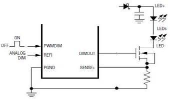 具體實(shí)現(xiàn)PWM調(diào)光的方法就是在LED的負(fù)載中串入一個(gè)MOS開(kāi)關(guān)管(圖8),這串LED的陽(yáng)極用一個(gè)恒流源供電。
