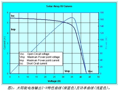 在上述公式的指導(dǎo)下,在太陽(yáng)能方陣模擬器內(nèi)部可以精確的建立一條I-V曲線(xiàn),用來(lái)仿真某一特定環(huán)境條件下太陽(yáng)能電池板的輸出,如圖1所示。無(wú)論負(fù)載如何改變,太陽(yáng)能方陣模擬器的工作點(diǎn)將始終位于這條曲線(xiàn)之上。