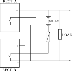 一個(gè)使電源系統(tǒng)簡(jiǎn)化的新功能是整流器內(nèi)置低壓斷開(kāi)裝置。這一功能會(huì)在市電斷電一段時(shí)間后電池電壓低于閾值時(shí)發(fā)揮作用,這就防止了電池的永久性損壞。如果是大量模塊并聯(lián)的系統(tǒng),在每個(gè)模塊內(nèi)置低壓斷開(kāi)裝置很不實(shí)際;這時(shí)選用系統(tǒng)解決辦法更合適。在較小的系統(tǒng)即2個(gè)模塊并聯(lián)(1+1),每個(gè)模塊都內(nèi)置一個(gè)低壓斷開(kāi)裝置很理想。這會(huì)使系統(tǒng)特別簡(jiǎn)易,只有兩個(gè)整流器,一個(gè)電池和一個(gè)電池保險(xiǎn)。圖3是系統(tǒng)框圖。