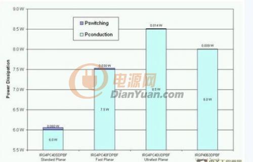 低壓側(cè)IGBT同樣有同一問題。究竟哪一種IGBT才能提供最低的功耗?由于這些IGBT只會進行 50Hz或60Hz切換,如圖5所示,標(biāo)準(zhǔn)速度IGBT可提供最低的功耗。雖然標(biāo)準(zhǔn)IGBT會帶來一些開關(guān)損耗,但數(shù)值并不足以影響IGBT的總功耗。事實上,最新的槽柵IGBT仍然擁有較高的功耗,因為這一代的槽柵IGBT專門針對高頻率應(yīng)用而設(shè)計,以平衡開關(guān)和導(dǎo)通損耗為目標(biāo)。因此,對低壓側(cè)IGBT 來說,標(biāo)準(zhǔn)速度平面式IGBT仍然是必然選擇。