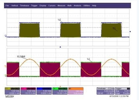 脈寬調(diào)制這些IGBT的最佳方法是什么?怎樣才能把功耗降到最低呢?方法之一是僅對高壓側(cè)IGBT進行脈寬調(diào)制,對應(yīng)的低壓側(cè)IGBT以50Hz或60Hz換相。圖2所示為一個典型的柵壓信號。當(dāng)Q1 正進行脈寬調(diào)制時,Q4維持正半周期操作。Q2和Q3在正半周期保持關(guān)斷 。到了負(fù)半周期,當(dāng)Q3進行脈寬調(diào)制時,Q2保持開啟狀態(tài)。Q1和Q4會在負(fù)半周期關(guān)斷。圖2 也顯示了通過輸出濾波電容器C1的AC正弦電壓波形。
