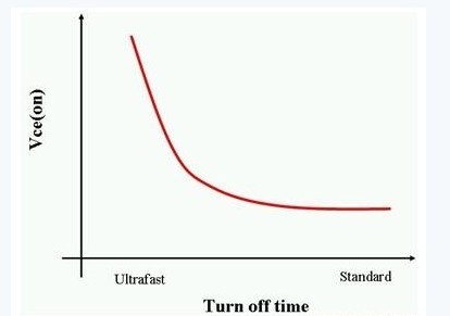 IGBT基本上是具備金屬門氧化物門結(jié)構(gòu)的雙極型晶體管 (BJT) 。這種設(shè)計讓IGBT的柵極可以像MOSFET一樣,以電壓代替電流來控制開關(guān)。作為一種BJT,IGBT的電流處理能力比MOSFET更高。同時,IGBT亦如BJT一樣是一種少數(shù)載體元件。這意味著 IGBT關(guān)閉的速度是由少數(shù)載體復(fù)合的速度快慢來決定。此外,IGBT的關(guān)閉時間與它的集極-射極飽和電壓 (Vce(on)) 成反比(如圖3所示)。