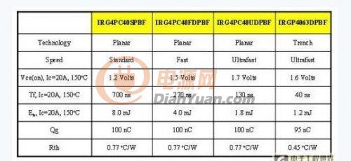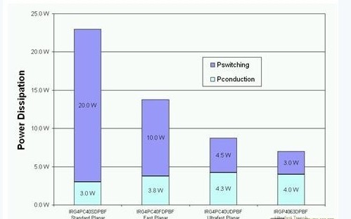 前文討論了高壓側(cè) IGBT在20kHz或以上頻率進行切換。假設(shè)設(shè)計一個擁有230V交流輸出的1.5kW 太陽能逆變器,表1中哪種IGBT具有最低的功耗呢?圖4顯示了IGBT在20kHz進行切換的功耗分析,由此可見超速平面式IGBT比其它兩種平面式 IGBT具有更低的總功耗。