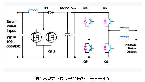 升壓+H-橋拓?fù)涫翘柲苣孀兤鳂O為常用的拓?fù)渲?,是一種兩級非隔離拓?fù)?。其第一級是升壓級,用于把模塊的可變輸出電壓(例如100V – 500V)升高到更大的中間電壓,后者必須大于實際峰值主線電壓(如230V x sqrt(2),或>325V)。該升壓級還有一個重要作用,就是為了實現(xiàn)效率最大化,太陽能模塊必須運作產(chǎn)生盡可能大的功率,而太陽能模塊的功率 曲線可通過輸出電流乘以輸出電壓數(shù)值獲得。功率特性中有一個最大點,被稱為“最大功率點”或MPP,而這精確位置會隨著模塊的類型、溫度和日照陰影等因素而變化。