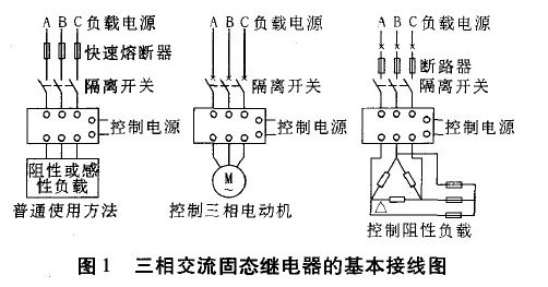 單相SSR為四端有源器件,其中兩個(gè)輸入控制端,兩個(gè)輸出端,輸入輸出間為光隔離,輸入端加上直流或脈沖信號(hào)到一定電流值后,輸出端就能從斷態(tài)轉(zhuǎn)變成通態(tài)。而三相交流固態(tài)繼電器則是集三只單相交流固態(tài)繼電器為一體,并以單一輸入端對(duì)三相負(fù)載進(jìn)行直接開(kāi)關(guān)切換,可方便地控制l一相交流電機(jī)、加熱器等三相負(fù)載,圖1為三相交流固態(tài)繼電器的基本接線圖。三相交流固態(tài)繼電器的相與相問(wèn),輸入輸出間,以及與基板之間絕緣電壓大于2 000 VAC,其他基本指標(biāo)與相應(yīng)的單相固態(tài)繼電器相同。需要指出的是對(duì)實(shí)際負(fù)載電流不大的場(chǎng)合,比如實(shí)驗(yàn)室教學(xué),三相SSR使用起來(lái)比較方便,但電流大時(shí)發(fā)熱亦大,這時(shí)使用三只單相SSR更為可靠。