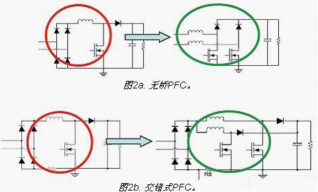 改善PFC能效的目標(biāo)是為了實(shí)現(xiàn)功率因數(shù)校正短的效率達(dá)到96%以上。采用無(wú)橋PFC(圖2a)可以減少橋損耗,采用交錯(cuò)式PFC(圖2b)可以滿足較高功率應(yīng)用的要求,以提升PFC能效。此外,還可以利用IC技術(shù)減少開(kāi)關(guān)損耗,并利用更優(yōu)化的拓?fù)浣Y(jié)構(gòu)來(lái)減少EMI濾波器損耗。