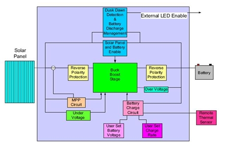 在白天時間系統(tǒng)對電池充電,而在夜間電池放電照亮定義的空間。雖然輸入能量不能保證,但輸出能量可在相當長的時間保持不變。如果一個系統(tǒng)的大小不合適,電池可能因放電而損壞。要防止電池損壞,必須用 LED 電路抑制操作,防止電池耗盡。