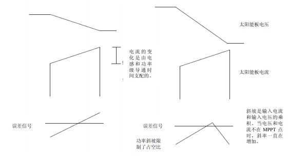 為了從功率可變的電源(即太陽能電池板)析取出最大的功率,太陽能控制器必須采用 MPPT。MPPT 必須首先找到最大功率點并及時調(diào)整環(huán)境條件,以保持控制器接近最大功率點。動態(tài) MPPT 用在系統(tǒng)發(fā)生改變的情況下。由于每個開關(guān)周期都在發(fā)生變化,太陽能電池板汲取的功率也會在每個周期有明顯的改變。動態(tài)MPPT利用太陽能電池板的電壓驟降乘以每個開關(guān)周期增加的電流,以確定將要產(chǎn)生的誤差信號來調(diào)節(jié)占空比。動態(tài)響應(yīng)可檢測 IV 曲線的斜率,從而建立一個功率斜坡,從誤差信號相交點建立一個代表占空比的功率。當斜坡變化斜率從正到負時該周期結(jié)束,如圖 2 所示。