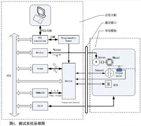 目前,汽車傳感器沒有一個統(tǒng)一的行業(yè)標(biāo)準(zhǔn),基本是按照使用者的要求定制。譬如目標(biāo)輪及其轉(zhuǎn)速、空氣氣隙和傳感器的安裝尺寸各不相同,即使是傳感器裝配到同一種車型上,也會隨著安裝位置的不同而存在差異。但是,同一臺設(shè)備不可能滿足全部傳感器的測試要求,由此引入模塊化的設(shè)計思想,即系統(tǒng)中相同的部分,如測試儀器、測試軟件、氣動控制系統(tǒng)、主電路系統(tǒng),作為公用資源(這里稱為“主機”);對系統(tǒng)中要求隨著傳感器變化的部分,如目標(biāo)輪及馬達、夾具及專用電路,被看成模塊。主機和模塊之間采用快插的方式完成電氣連接且為標(biāo)準(zhǔn)化接口,可進行后續(xù)擴展。當(dāng)測試不同傳感器時,選用不同的測試模塊連接到主機上即可。