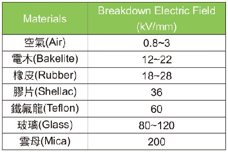 表1 各種絕緣材料的崩潰電場(chǎng)