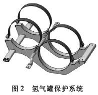 ( 2) 氫氣罐保護(hù)。高壓氫氣罐的固定支架和鋼帶應(yīng)有足夠的強度,以保證在碰撞過程中,高壓氫氣罐的動態(tài)位移不會太大,避免造成連接管路的斷裂、變形和氫氣的大量泄漏。何健[13]基于顯式有限元理論,按照 CMVDR294 法規(guī)對國內(nèi)自主開發(fā)的某燃料電池轎車進(jìn)行正面碰撞分析,對比分析兩種氫氣罐保護(hù)系統(tǒng)設(shè)計方案的計算結(jié)果,提出了安全有效的氫氣罐保護(hù)方案,即氫氣罐保護(hù)系統(tǒng)采用整體式設(shè)計。如圖 2 所示,氫氣罐框架通過 3 根橫梁和 2 根縱梁將兩個氫氣罐集成到一個框架總成??v梁截面為“Π”形,由幾塊板材拼焊而成,中部設(shè)計出兩個圓弧形凹槽,可以對氫氣罐進(jìn)行有效的固定和保護(hù)。