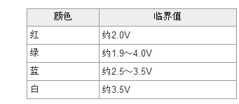 LED具有一般硅二極管的類(lèi)似特性,在正負(fù)極之間施加電壓。當(dāng)外加電壓達(dá)到一個(gè)臨界值,LED中產(chǎn)生電流,開(kāi)始發(fā)光。當(dāng)電壓超過(guò)這個(gè)臨界值時(shí),電流急劇增加。白色LED的臨界電壓值約3.5V。紅色、綠色、藍(lán)色的LED臨界電壓值如表1所示。