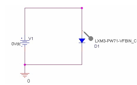 我們用電路仿真來(lái)說(shuō)明LED的電子特性以及驅(qū)動(dòng)電路。電路仿真是對(duì)LED和電阻等的電子設(shè)計(jì)進(jìn)行建模并在計(jì)算機(jī)上模擬計(jì)算電路運(yùn)行的一種簡(jiǎn)易方法。這里使用的是Cadence公司的電路仿真PSpice A/D。同時(shí)使用了飛利浦照明公司的LUXEON系列LX3-PW71。