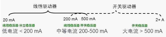 如今在市場(chǎng)上典型的LED驅(qū)動(dòng)器包括兩類(lèi),即線(xiàn)性驅(qū)動(dòng)器和開(kāi)關(guān)驅(qū)動(dòng)器;大概的適用范圍見(jiàn)圖5.如電流大于500mA的大電流應(yīng)用采用開(kāi)關(guān)穩(wěn)壓器,因?yàn)榫€(xiàn)性驅(qū)動(dòng)器限于自身結(jié)構(gòu)原因,無(wú)法提供這樣大的電流;而在電流低于200mA的低 電流應(yīng)用中,通常采用線(xiàn)性穩(wěn)壓器或分離穩(wěn)壓器;而在200至500mA的中等電流應(yīng) 用中,既可以采用線(xiàn)性穩(wěn)壓器,也可以采用開(kāi)關(guān)穩(wěn)壓器。