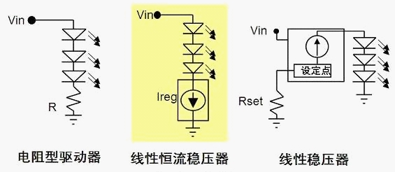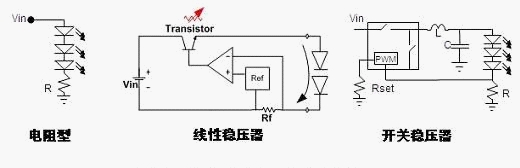 開(kāi)關(guān)穩(wěn)壓器的能效高,且提供極佳的亮度控制。線(xiàn)性穩(wěn)壓器結(jié)構(gòu)比較簡(jiǎn)單,易于設(shè)計(jì),提供穩(wěn)流及過(guò)流保護(hù),且沒(méi)有電磁兼容性(EMC)問(wèn)題。