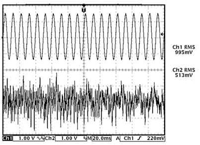 常見的音源,包含樂音和語音,其RMS值往往比峰值輸出功率低得多。通常情況下,語音的峰值與RMS功率之比(即波峰因數)為12dB,而樂音的波峰因數為 18~20dB。圖1為時域內音頻信號和正弦波的波形圖,給出了采用示波器測量兩者RMS值的結果。雖然音頻信號峰值略高于正弦波,但其RMS值大概只有正弦波的一半。同樣,音頻信號可能存在突變,但正如測量結果所示,其平均值仍遠低于正弦波。雖然音頻信號可能具有與正弦波相近的峰值,但D類放大器表現出來的熱效應卻大大低于正弦波。因此,測量系統的熱性能時,最好使用實際音頻信號而非正弦波作為信號源。如果只能使用正弦波,則所得到的熱性能要比實際系統差。