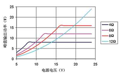 D 類放大器MOSFET輸出級的導通電阻會影響它的效率和峰值電流能力。降低負載的峰值電流可減少MOSFET的I2R損耗,進而提高效率。要降低峰值電流,應在保證輸出功率, D類放大器的電壓擺幅以及電源電壓的限制的條件下,選擇最大阻抗的揚聲器,如圖4所示。本例中,假設D類放大器的輸出電流為2A,電源電壓范圍為 5~24V。電源電壓大于等于8V時,4Ω的負載電流將達到2A,相應的最大連續(xù)輸出功率為8W。如果8W的輸出功率能滿足要求,則可以考慮使用一個 12Ω揚聲器和15V供電電壓,此時的峰值電流限制在1.25A,對應的最大連續(xù)輸出功率為9.4W。此外,12Ω負載的工作效率要比4Ω負載的高出 10%~15%。實際效率的提高根據不同D類放大器而異。雖然大多數揚聲器的阻抗都采用4Ω或8Ω,但也可采用其他阻抗的揚聲器實現更高效的散熱。