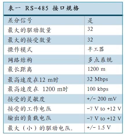 表一詳細的說明了RS-485 接口的規(guī)范。主要的參數(shù)包括-7V 到+12V 的工作電壓,32Mbps 的數(shù)據(jù)傳輸速度已經1200 米的傳輸距離等。一個完全兼容的RS-485 接口必須符合 IEC61000-4-2(靜電),IEC61000-4-4(群脈沖)和 IEC61000-4-5 (浪涌)標準。