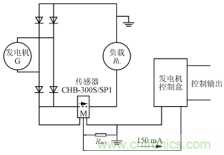 在某型地面車輛上裝備了一套獨(dú)立的大功率發(fā)電系統(tǒng),該發(fā)電系統(tǒng)設(shè)計(jì)選用了CHB-300S型閉環(huán)霍爾電流傳感器作為系統(tǒng)電流檢測(cè)部件,通過對(duì)傳感器的輸出信號(hào)進(jìn)行處理,設(shè)定限流工作點(diǎn),確保發(fā)電系統(tǒng)的輸出功率不高于發(fā)電機(jī)的額定功率。閉環(huán)霍爾電流傳感器CHB-300S的應(yīng)用,很好地實(shí)現(xiàn)了上述應(yīng)用目的。如圖3所示,發(fā)電機(jī)G輸出正端匯流母線穿過CHB-300S/SP1的原邊電流穿孔,由傳感器CHB-300S/SP1檢測(cè)發(fā)電機(jī)的輸出電流,傳感器的輸出IM與發(fā)電機(jī)控制盒相連,由發(fā)電機(jī)控制盒設(shè)定發(fā)電機(jī)的輸出電流控制點(diǎn),依據(jù)此信號(hào),對(duì)發(fā)電機(jī)的輸出電流加以限制,避免發(fā)電機(jī)因輸出功率過高而發(fā)生故障或損壞,從而保證發(fā)電系統(tǒng)正常工作。