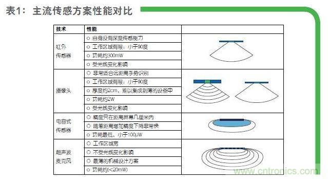 在數(shù)字超聲波麥克風出現(xiàn)后,由于對環(huán)境光線沒要求(黑暗中也能精準感測)、很容易測得距離/景深等特殊性能,有先見的系統(tǒng)公司紛紛采用該技術(shù)實現(xiàn)一些特有的手勢識別、距離感應等應用。Khamharn指出超聲波的方案性能相對更穩(wěn)定且成本更低,特地為大家對比了超聲波麥克風和目前主流傳感器的性能對比,如表一所示。